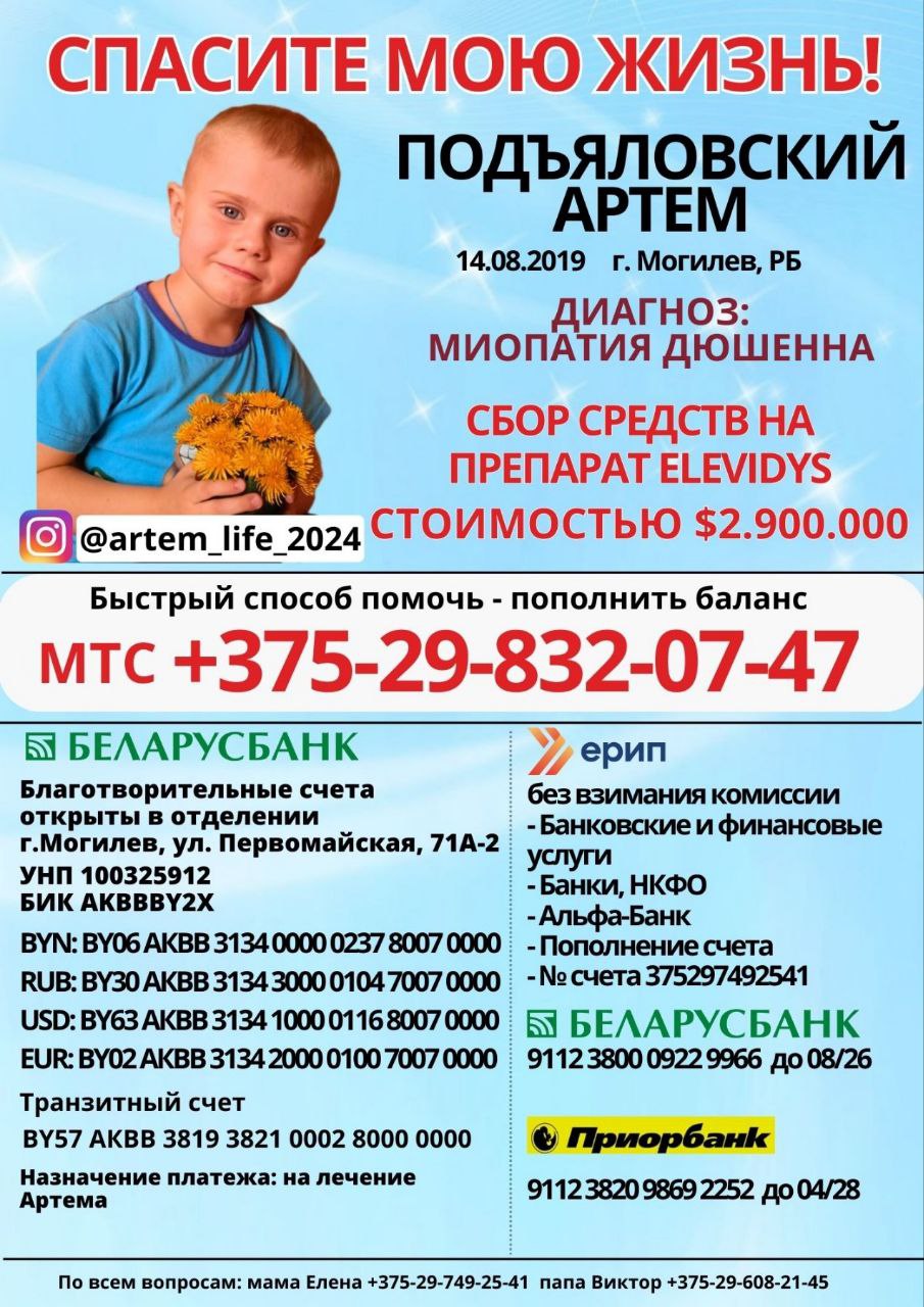 Для лечения Артему необходимо введение генно-терапевтического лекарства стоимостью 2,9 млн долларов. Времени мало. Препарат нужно ввести пока Артему не исполнится 5 лет.