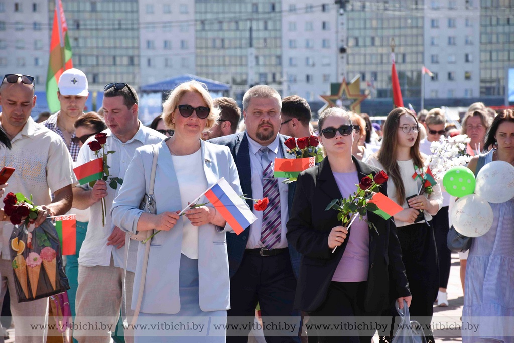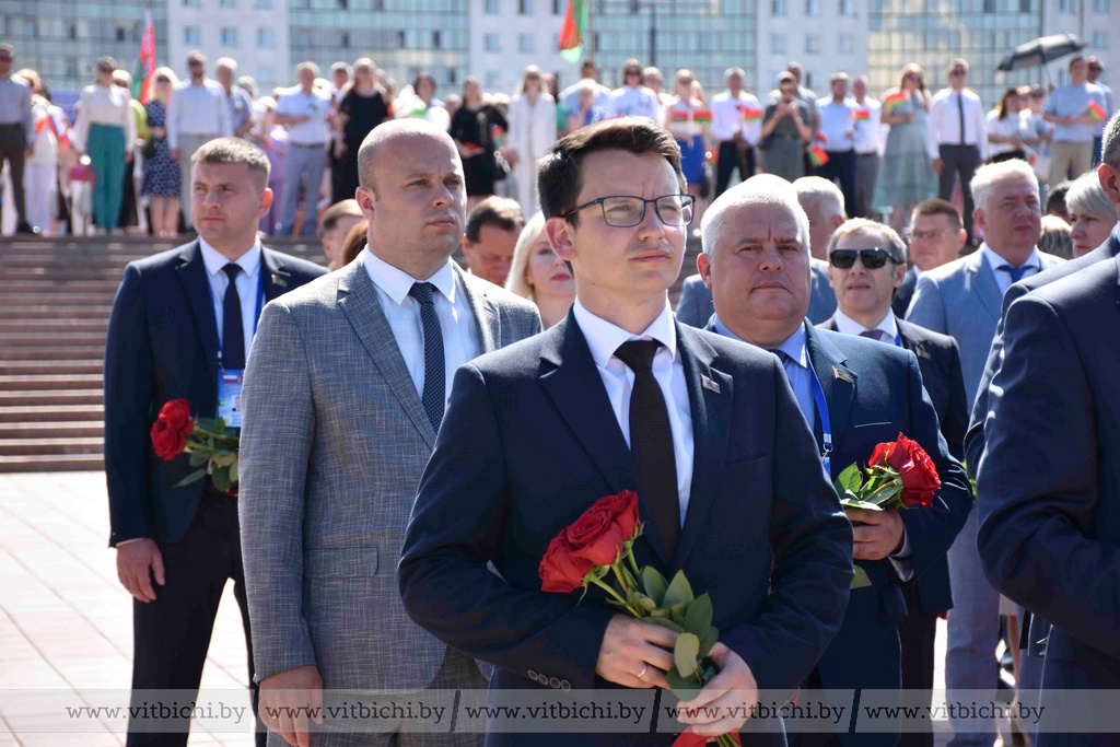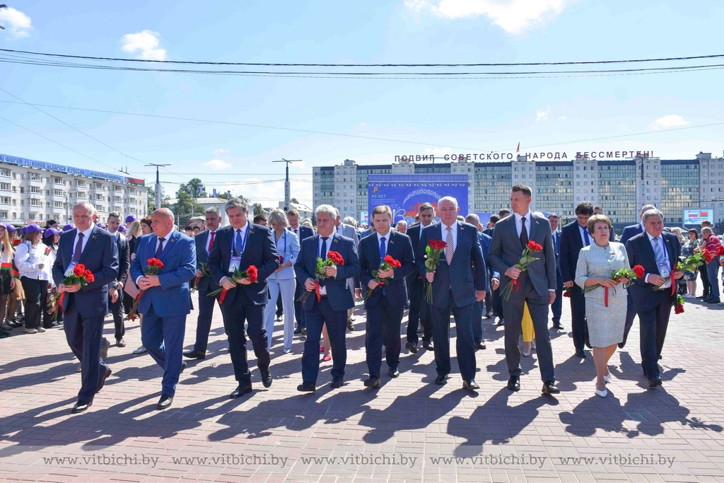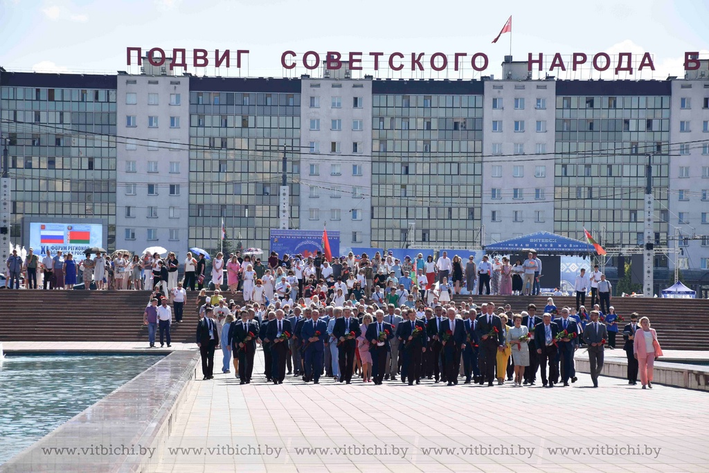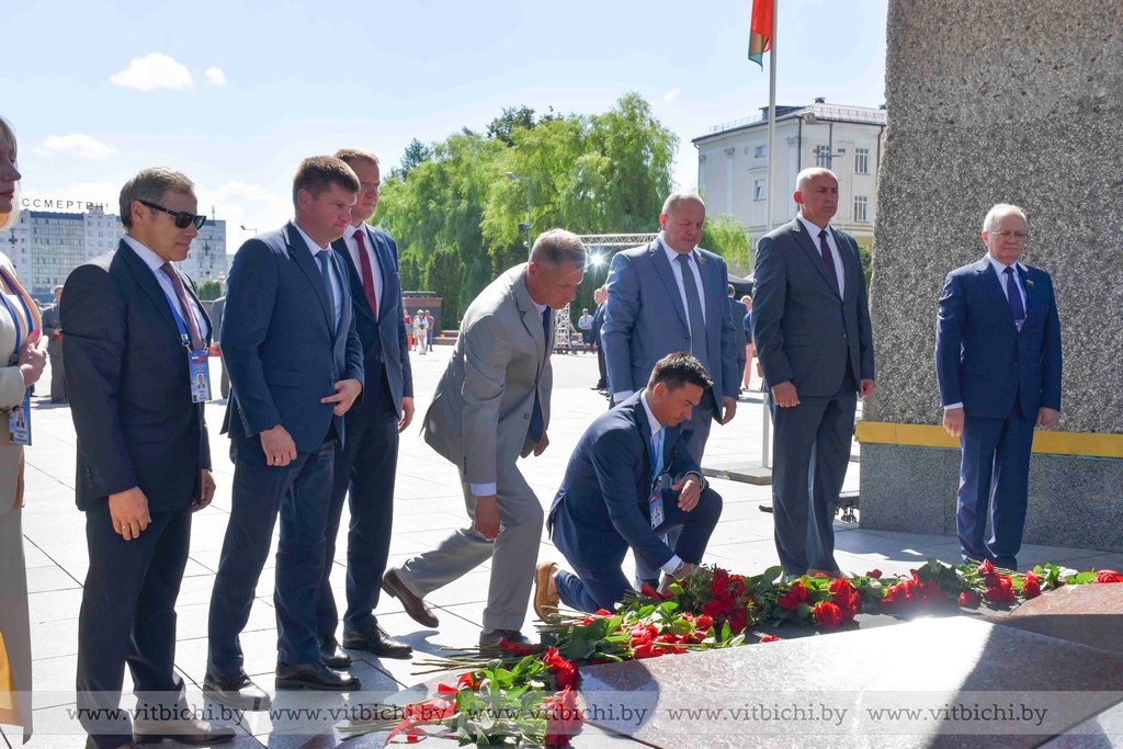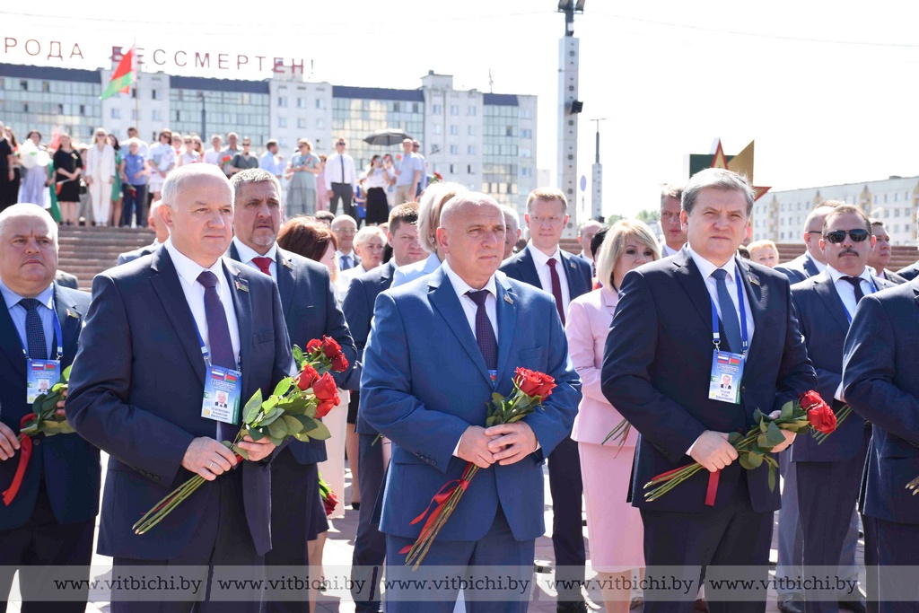 Представители официальных делегаций — члены Совета Республики Национального собрания Беларуси и сенаторы Совета Федерации Федерального собрания России, руководство города, общественность возложили цветы к вечному огню мемориального комплекса.