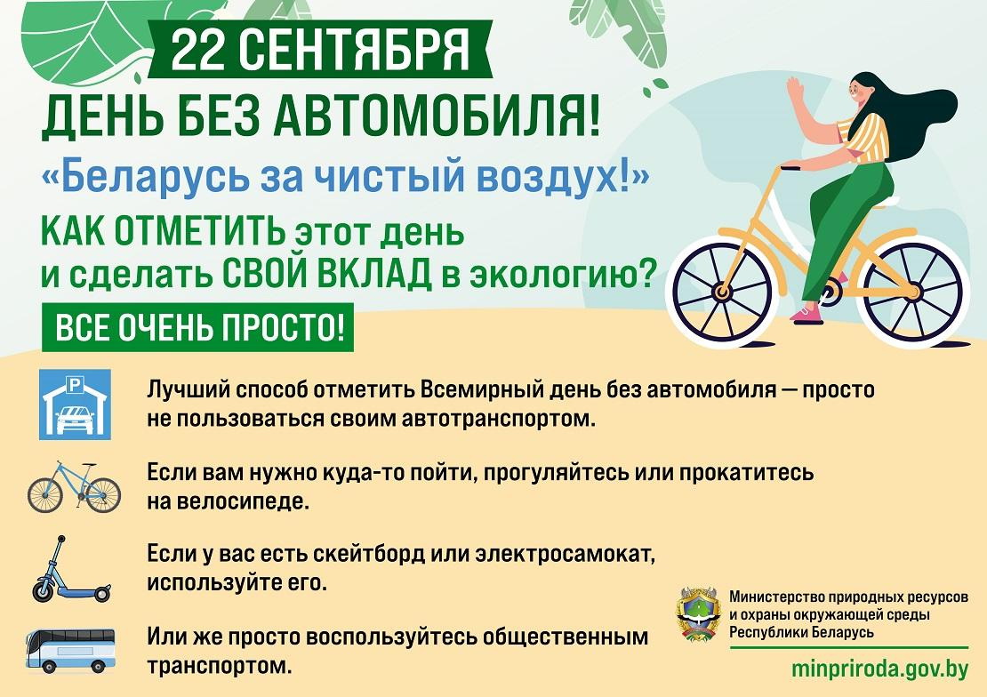 Акция «День без автомобиля» в Республике Беларусь и в г. Минске впервые прошла 22 сентября 2008 года. Организаторами мероприятия выступили Министерство природных ресурсов и охраны окружающей среды Республики Беларусь (далее – Минприроды) и Министерство транспорта и коммуникаций Республики Беларусь, при поддержке областных и Минского городского исполнительных комитетов.Акция стала ежегодной и очень популярной: проводимые мероприятия накануне 22 сентября и непосредственно в это день, привлекают большое внимание общественности и позволяют поучаствовать всем желающим. Это квесты и велопробеги, конкурсы и выставки — каждый найдет по душе свое мероприятие и тем самым внесет свою лепту в спасение воздуха и атмосферы в наших населенных пунктах.