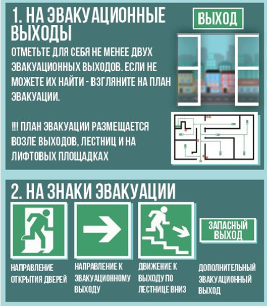 Эвакуационные знаки: используйте эвакуационные знаки для определения кратчайшего и безопасного маршрута движения к выходу.