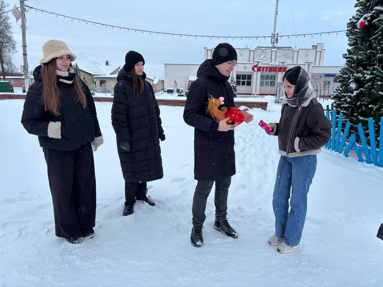 Председатель Молодежного совета Максим Сороко вручил девочке желанный подарок — подарочный сертификат! А в дополнение к нему — очаровательную игрушечную лошадку, символ наступающего года, с сюрпризом внутри: целой россыпью конфет!