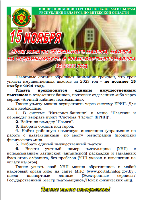 Налоговые органы обращают внимание граждан, что срок уплаты имущественных налогов за 2023 год – не позднее 15 ноября 2024 года