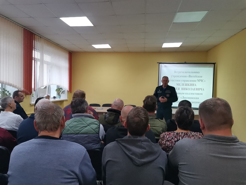 В рамках поездки в регион начальник Витебского областного управления МЧС Сергей Николаевич Мелешкин пообщался на тему безопасности с трудовым коллективом лечебно-профилактического учреждения «Лиозненская районная ветеринарная станция», провел личный прием граждан в зале заседаний райисполкома и встретился с личным составом районного отдела по чрезвычайным ситуациям.