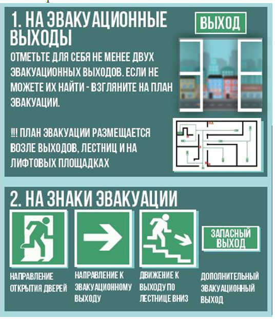Эвакуационные знаки: используйте эвакуационные знаки для определения кратчайшего и безопасного маршрута движения к выходу.