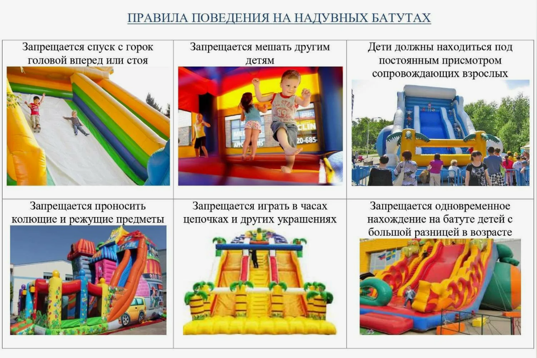 Изучив правила поведения и пользования аттракционом необходимо ознакомить с ними ребёнка и возможными опасностями в случае несоблюдения. Рассказать, что с горки спускаться можно только ногами вперёд, в положении лёжа на спине. Допускается спуск на животе, но исключительно ногами вперёд. А вот съезжать стоя или головой вперёд, лёжа на животе - травмоопасно. Не рекомендуется спускаться «паровозиком», держась друг за друга. Высок риск, что при попытках высунуться за пределы кабинок они могут травмироваться. Ребёнок должен вовремя отползать-откатываться после спуска с горки, так как вставать на ноги бывает опасно, и не у каждого это получится. Нельзя прыгать изо всех сил на батутах и лучше прыгать в стороне от других детей. Нельзя кататься и прыгать с едой, так как это небезопасно. Всегда выбирайте аттракцион по возрасту ребенка.